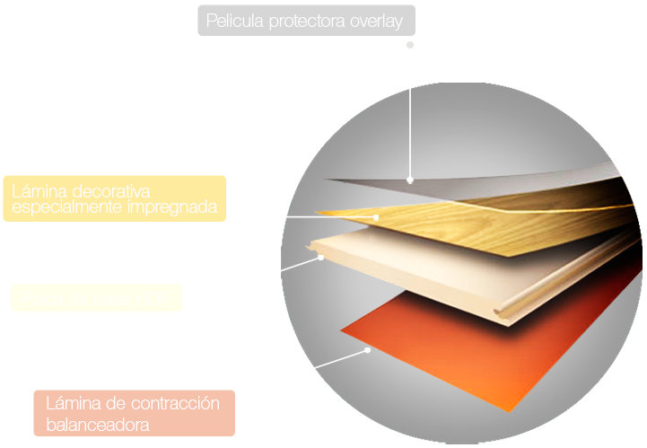 De gran fortaleza, mucha estabilidad y de gran resistencia a la humedad, la superficie o capa superior consiste en folios decorativos en imitación perfecta a la madera, cubierta con 9 capas de barniz a base de uretano y óxido de aluminio UV y secados con rayos ultravioleta que le confiere una alta resistencia al desgaste a la suciedad y a las manchas, la capa inferior presenta un folio melaminico que le confiere integridad y estabilidad, además los pisos presentan los 4 cantos biselados para darle una apariencia a la madera real